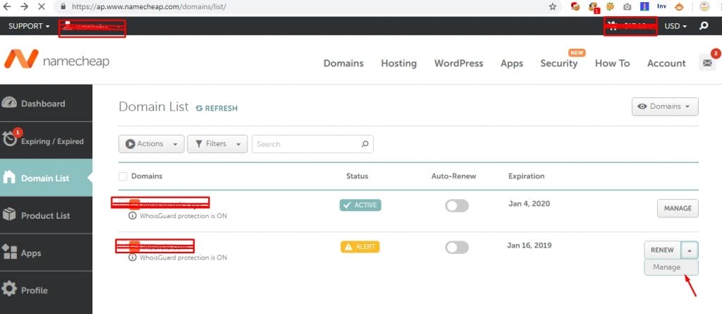 1. Masuk ke akun namecheap anda, kemudian masuk ke menu domain list, terus pilih salah satu domain yang ingin ditransfer. Klik manage.